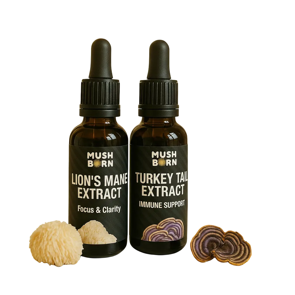 Experience the powerful synergy of Lion's Mane and Turkey Tail for a holistic approach to wellness with MUSHBORN's Ultimate Tincture Duo.