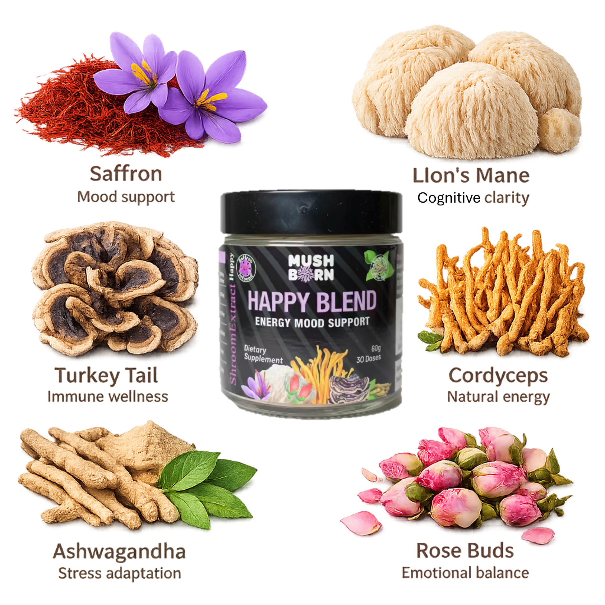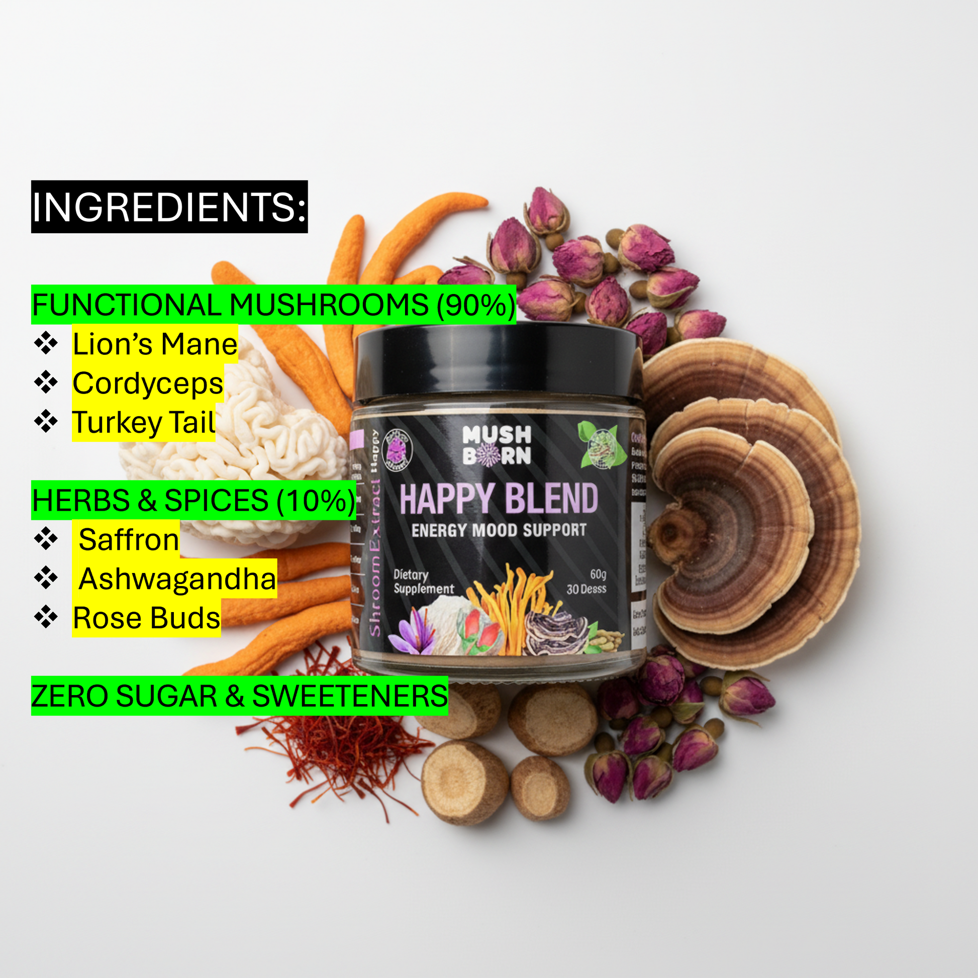 85% premium functional mushrooms (Lion’s Mane, Cordyceps, Turkey Tail) and 15% spices & botanicals (Saffron, Ashwagandha, Rose Buds).